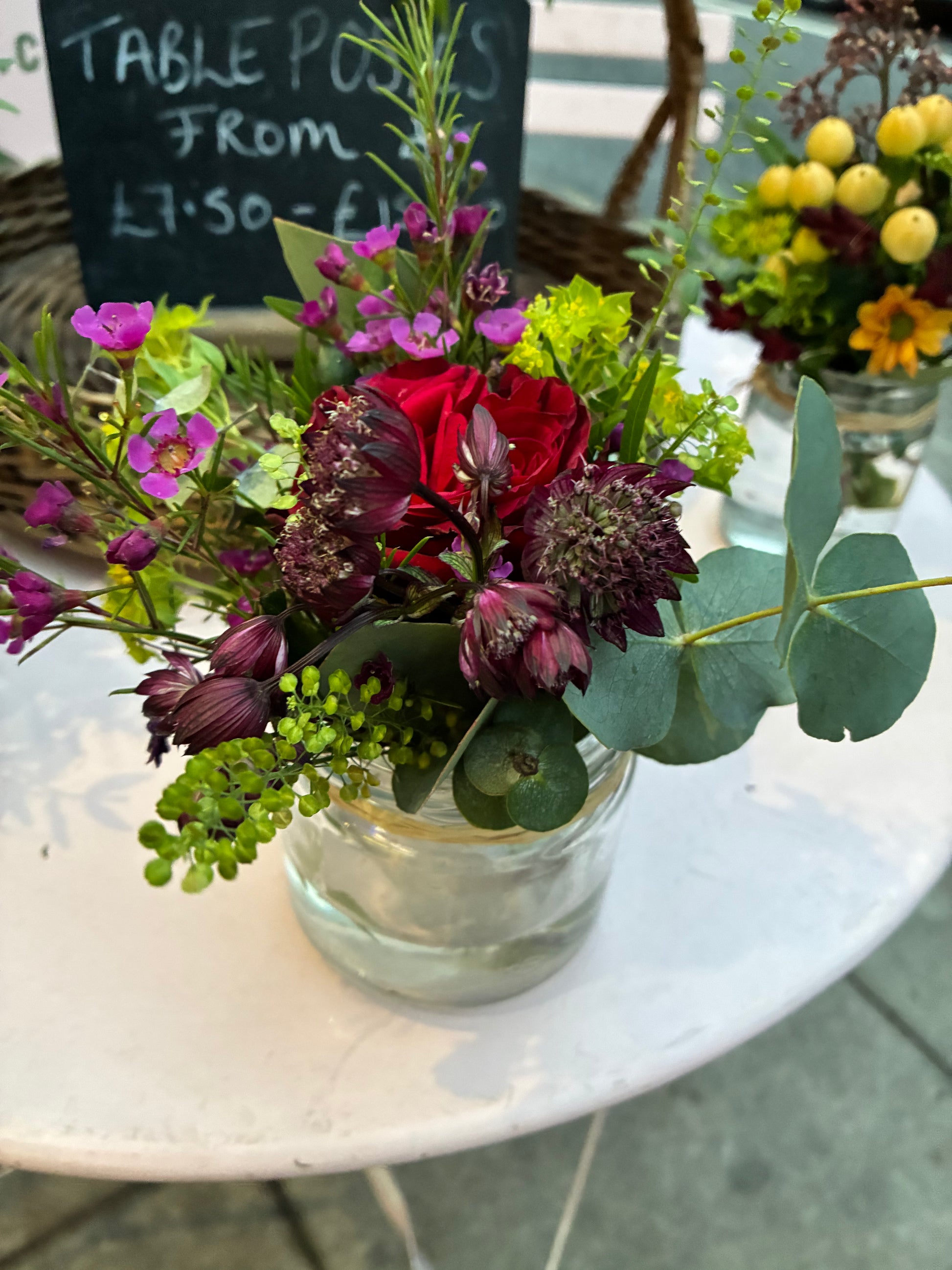 Natural Jam Jar Posies made from recycled jars and beautiful flowers. Great as small gifts, as dining table posies and for all occasions. Colour themes available on request.